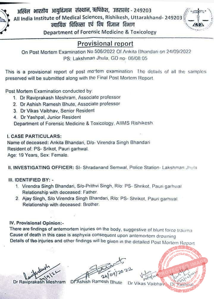 एसडीआरएफ ने शनिवार सुबह अंकिता भंडारी का शव को चीला बैराज से बरामद किया था। एम्स ऋषिकेश के डाक्टरों के पैनल से शव का पोस्टमार्टम किया। प्रोविशनल पीएम रिपोर्ट में अंकिता के शरीर पर चोट के निशान पाए गए हैं। पीएम रिपोर्ट के अनसार अंकिता की मौत पानी में डूबने से हुई है।