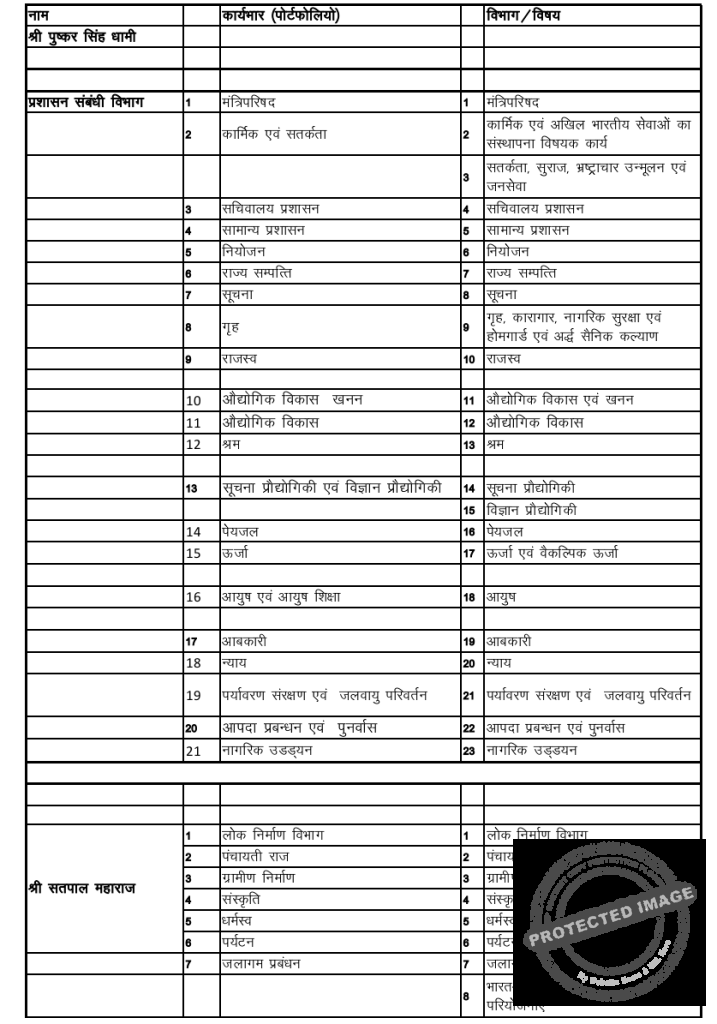 UTTARAKHAND PORTFOLIO: हो गया विभागों का बंटवारा, प्रेमचंद अग्रवाल बने वित्त मंत्री, सतपाल महाराज को लोक निर्माण विभाग की जिम्मेदारी तो धन सिंह रावत बने शिक्षा मंत्री…