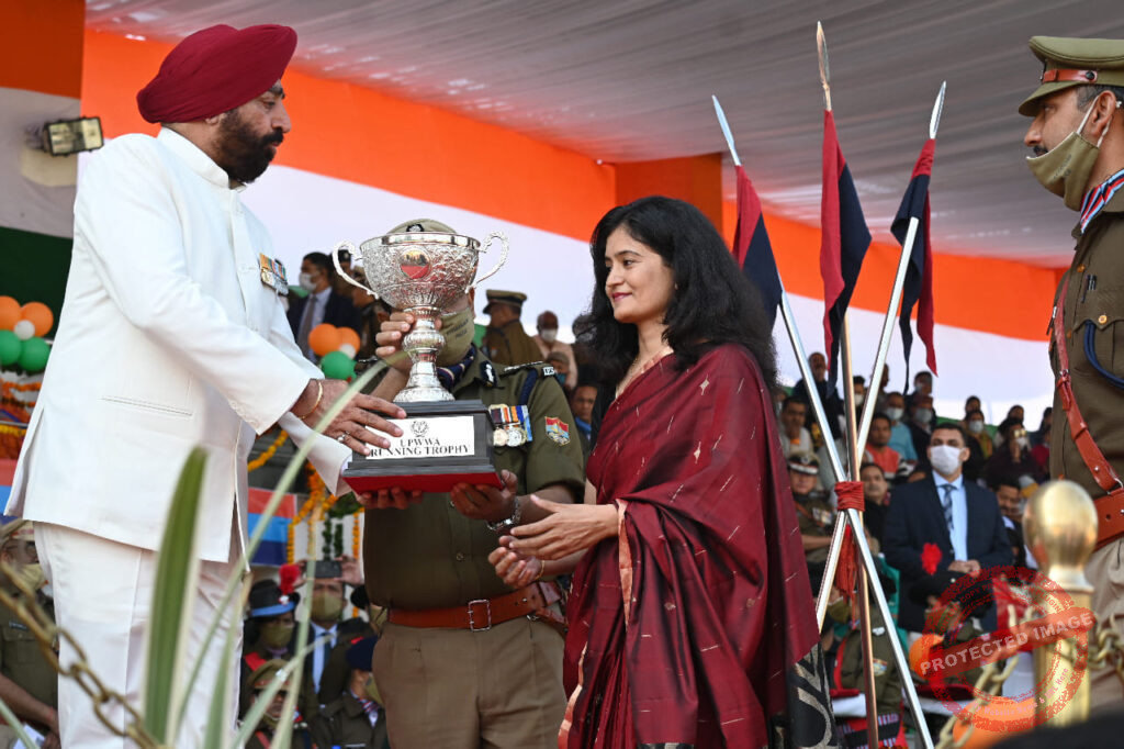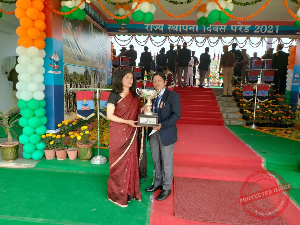 UPWWA अल्मोड़ा पुलिस को राज्य_में प्रथम_स्थान_प्राप्त होने पर जिलाध्यक्ष UPWWA अल्मोड़ा श्रीमती हेमा बिष्ट महोदया को राज्य स्थापना दिवस के अवसर पर आयोजित रैतिक_परेड के शुभ अवसर पर मुख्य अतिथि महामहिम राज्यपाल महोदय उत्तराखण्ड श्री गुरमीत सिंह द्वारा मा0 मुख्यमंत्री उत्तराखण्ड सरकार श्री पुष्कर सिंह धामी जी के अतिरिक्त पुलिस महानिदेशक उत्तराखंड श्री अशोक कुमार एवं उनकी धर्मपत्नी डॉ0 अलकनंदा अशोक की गरिमामयी उपस्थिति में विजेता की ट्राफी सौंपी गई।