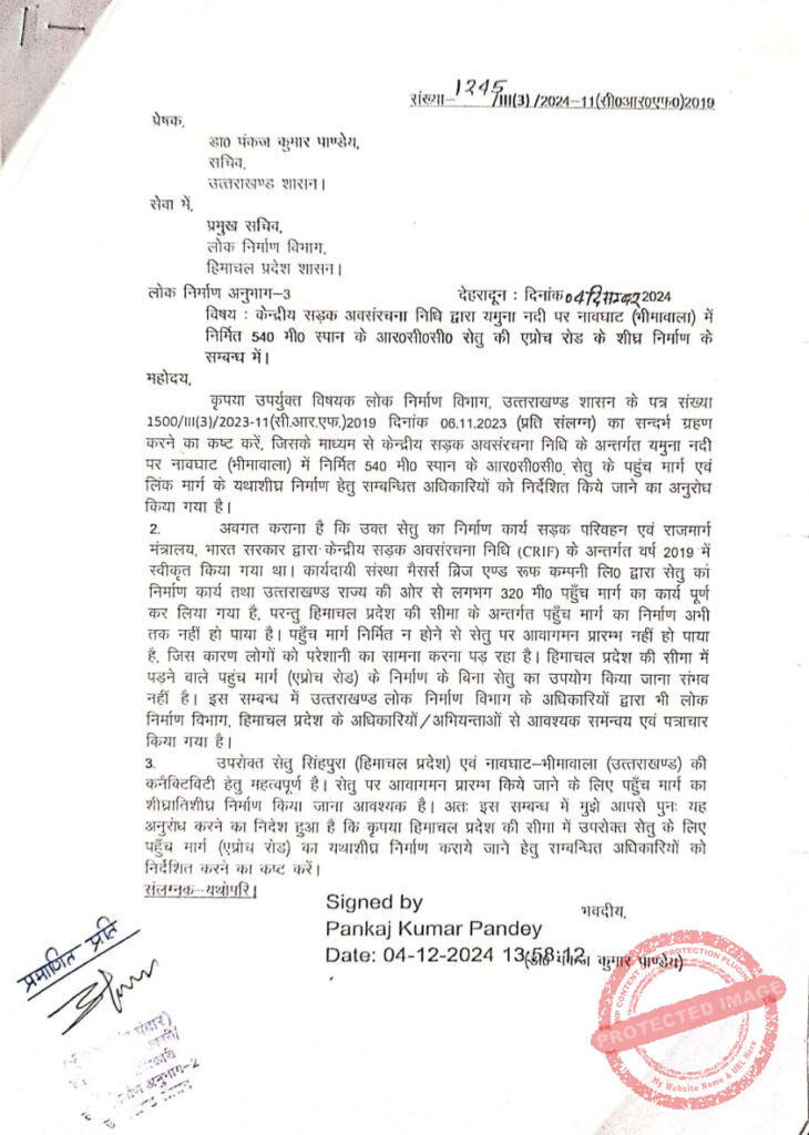 • ЁЯМЙ рдкреБрд▓ рдмрдирд╛, рд▓реЗрдХрд┐рди рд░рд╛рд╕реНрддрд╛ рдирд╣реАрдВ! 2015 рдореЗрдВ рд╕реНрд╡реАрдХреГрдд рдЗрд╕ рдкреБрд▓ рдХрд╛ рдирд┐рд░реНрдорд╛рдг рддреЛ рдкреВрд░рд╛ рд╣реЛ рдЧрдпрд╛, рд▓реЗрдХрд┐рди рд╣рд┐рдорд╛рдЪрд▓ рдкреНрд░рджреЗрд╢ рдХреА рддрд░рдл рд╕реЗ рдХрдиреЗрдХреНрдЯрд┐рд╡рд┐рдЯреА рдирд╣реАрдВ рдмрдирд╛рдИ рдЧрдИред