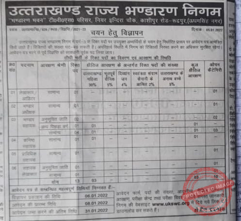 *13 पदों हेतु निगम प्रबंधन ने की है विज्ञप्ति जारी | *ईडब्ल्यूएस हेतु 10 फ़ीसदी आरक्षण का है प्रावधान, लेकिन कोई व्यवस्था नहीं !ओबीसी हेतु रखा गया है सिर्फ एक पद! अनुसूचित जाति महिला को किया क्षैतिज आरक्षण से बाहर !