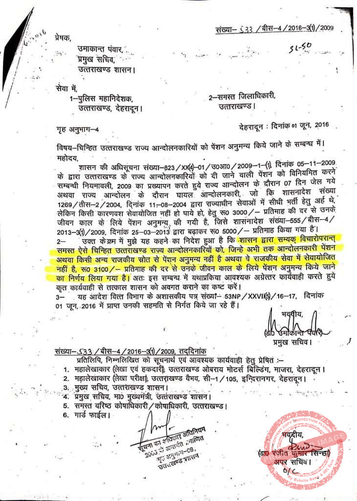 विकासनगर- जन संघर्ष मोर्चा कार्यकर्ताओं ने तहसील विकासनगर में मोर्चा अध्यक्ष एवं जीएमवीएन के पूर्व उपाध्यक्ष रघुनाथ सिंह नेगी के नेतृत्व में तहसील घेराव कर अन्य स्रोतों से दोहरी पेंशन प्राप्त कर रहे आश्रित राज्य आंदोलनकारियों को छूट दिलाने को लेकर मा. मुख्यमंत्री को संबोधित ज्ञापन उप जिलाधिकारी, विकास नगर श्री विनोद कुमार को सौंपा | नेगी ने कहा कि हाल ही में जिला प्रशासन द्वारा दोहरी पेंशन (आंदोलनकारी पेंशन व अन्य स्रोतों से मिलने वाली पेंशन) ले रहे राज्य आंदोलनकारियों से सिर्फ एक पेंशन लेने हेतु फरमान जारी किया गया है, जिसके तहत अन्य स्रोतों से मिलने वाली पेंशन या आंदोलनकारी पेंशन दोनों में से सिर्फ एक पेंशन को विकल्प के रूप में चुने जाने हेतु नोटिस जारी किए गए हैं एवं अन्यथा की स्थिति में कार्यवाही का जिक्र किया गया है | काबिल-ए-गौर है कि जिन आंदोलनकारियों को नोटिस जारी किए गए हैं, उनमें अधिकांश पारिवारिक (आश्रित) पेंशन लेने वाली श्रेणी के लोग हैं | यह अलग बात है कि शासनादेश दिनांक 6 अप्रैल 2017 में सिर्फ एक पेंशन लेने हेतु ही प्रावधानित है |