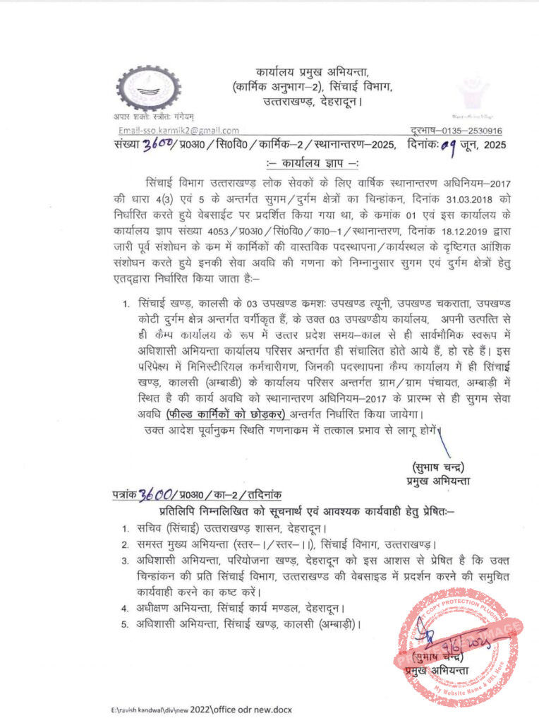 рд╡рд┐рдХрд╛рд╕рдирдЧрд░, рдЙрддреНрддрд░рд╛рдЦрдВрдб тАУ рд╕рд┐рдВрдЪрд╛рдИ рд╡рд┐рднрд╛рдЧ рдХреЗ рдХрд░реНрдордЪрд╛рд░рд┐рдпреЛрдВ рдХреЗ рд▓рд┐рдП рдПрдХ рдмрдбрд╝реА рдЦреБрд╢рдЦрдмрд░реА рд╣реИ! рд╡рд░реНрд╖реЛрдВ рд╕реЗ рджреБрд░реНрдЧрдо рдХреНрд╖реЗрддреНрд░ рдореЗрдВ рддреИрдирд╛рдд рдорд┐рдирд┐рд╕реНрдЯреНрд░рд┐рдпрд▓ рдХрд░реНрдордЪрд╛рд░рд┐рдпреЛрдВ рдХреЛ рдЕрдм рд╕реБрдЧрдо рдХреНрд╖реЗрддреНрд░ рдореЗрдВ рд╕реЗрд╡рд╛ рджреЗрдиреЗ рдХрд╛ рдореМрдХрд╛ рдорд┐рд▓реЗрдЧрд╛ред рдпрд╣ рдмрджрд▓рд╛рд╡ рдЬрди рд╕рдВрдШрд░реНрд╖ рдореЛрд░реНрдЪрд╛ рдХреЗ рдЕрдердХ рдкреНрд░рдпрд╛рд╕реЛрдВ рдХрд╛ рдирддреАрдЬрд╛ рд╣реИред