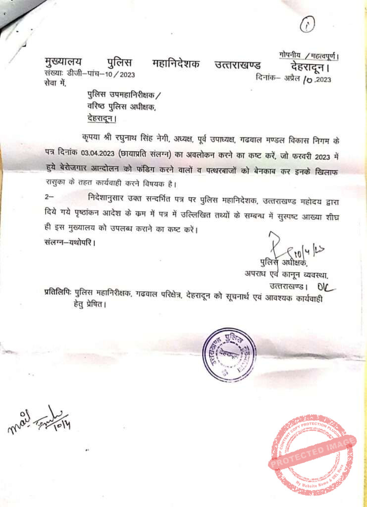 विकासनगर- जन संघर्ष मोर्चा अध्यक्ष एवं जीएमवीएन के पूर्व उपाध्यक्ष रघुनाथ सिंह नेगी ने बताया कि अप्रैल 2023 को मोर्चा प्रतिनिधिमंडल ने पुलिस महानिदेशक श्री अशोक कुमार से मुलाकात कर बेरोजगारों के आंदोलन को फंडिंग करने वाले व पत्थर बरसाने वाले पत्थरबाजों को चिन्हित कर इनके खिलाफ रासुका के तहत कार्रवाई को लेकर ज्ञापन सौंपा सौंपा था, जिसके क्रम में पुलिस मुख्यालय द्वारा एसएसपी/ डीआईजी से पूरे मामले पर रिपोर्ट उपलब्ध कराने के निर्देश दिए गए हैं |