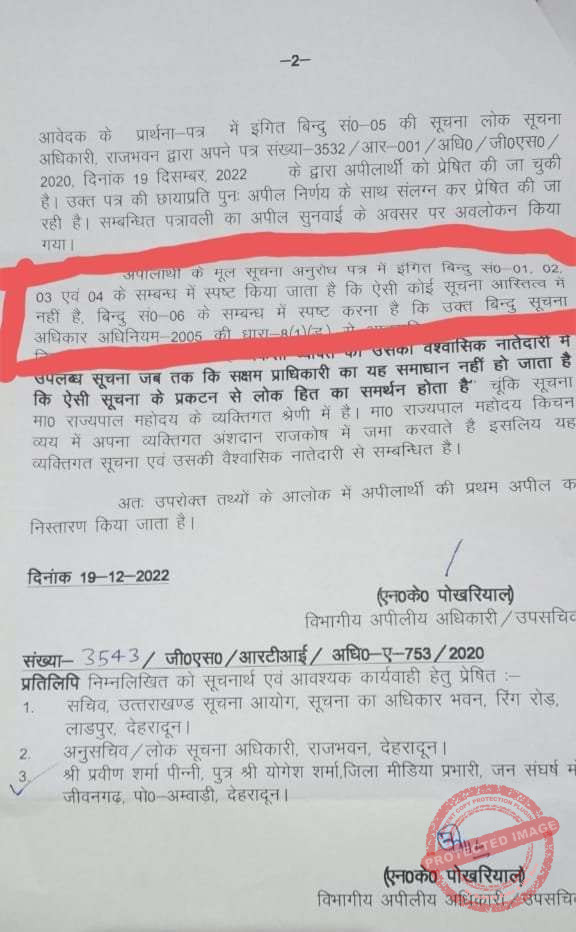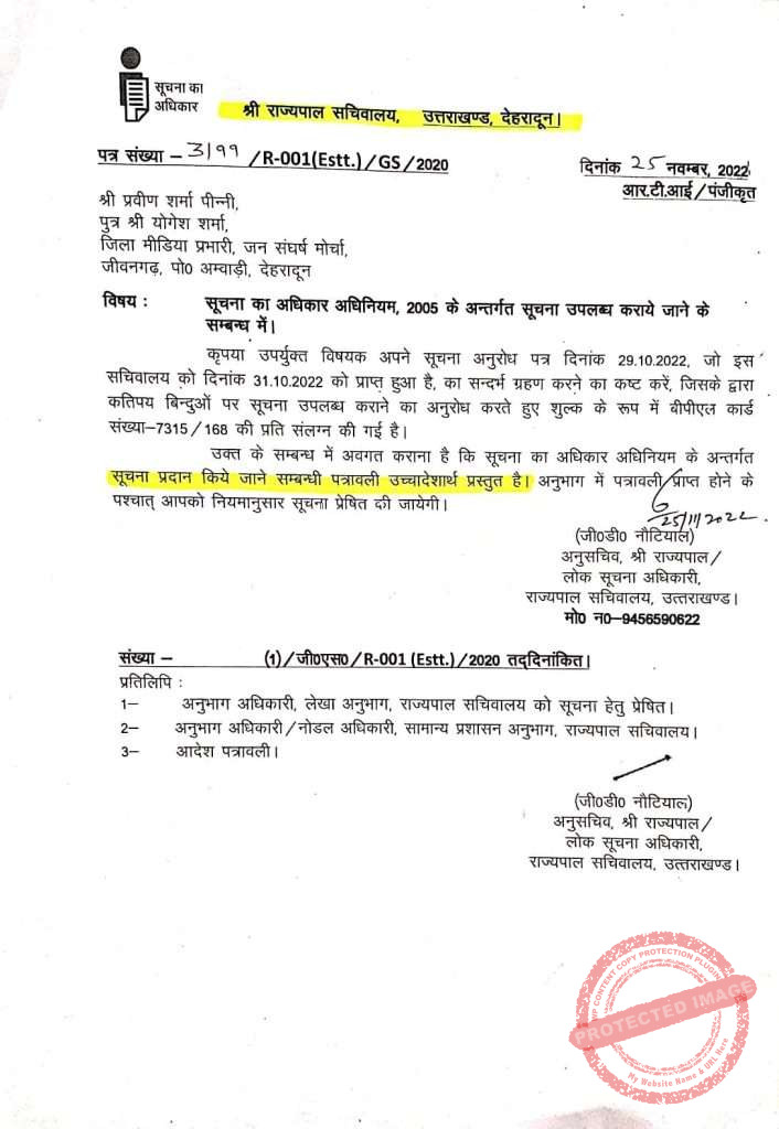 उक्त मामले को लेकर जन संघर्ष मोर्चा ने राजभवन से संपूर्ण खर्चे की पत्रावली से संबंधित जानकारी चाही कि कौन से नियम के तहत गौशालाओं को दान, साड़ी खरीद में अपनाई गई प्रक्रिया एवं किन-किन लोगों को वितरण की गई, किन-किन मंदिरों में कितना- कितना दान एवं गौशालाओं को निर्गत धनराशि एवं उनके पंजीकरण के सर्टिफिकेट की जानकारी चाही गई थी, लेकिन राजभवन द्वारा मामले को टालने के उद्देश्य से यह उल्लेख किया गया कि *पत्रावली उच्चादेशार्थ प्रस्तुत है* यानी आका के आदेश पर पत्रावली पर कुंडली मार ली गई, ताकि कारनामा सार्वजनिक न हो सके | *दो-चार दिन पहले राजभवन के उत्तराधिकारी ने मोर्चा के सवाल के जवाब में उल्लेख किया कि इस तरह की कोई पत्रावली अस्तित्व में ही नहीं है*| राजभवन जैसी संस्था में इस प्रकार का कारनामा निश्चित तौर पर जनता को बहुत बड़ा धोखा देने जैसा है |आखिर राजभवन को कौन सी चिंता खाए जा रही है कि पत्रावली सार्वजनिक करने में डर लग रहा है ! इससे बड़ी शर्मसार करने वाली बात क्या हो सकती है कि मंदिरों में 1000-2000 रुपए अपनी जेब से चढ़ाने के बजाय सरकारी खजाने से दिया गया !