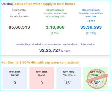 ओडिशा 2024 में ‘हर घर जल’ वाला राज्य बनने की योजना बना रहा है। राज्य के 85.67 लाख ग्रामीण परिवारों में से 35.37 लाख (41.28 प्रतिशत) घरों में नल के पानी की आपूर्ति है। गांवों में नल से जलापूर्ति की व्यवस्था करने के लिए जलापूर्ति का काम जोरों पर है। सभी ग्रामीण घरों में शत-प्रतिशत नल के पानी का सम्पर्क सुनिश्चित करने का प्रावधान किया गया है।