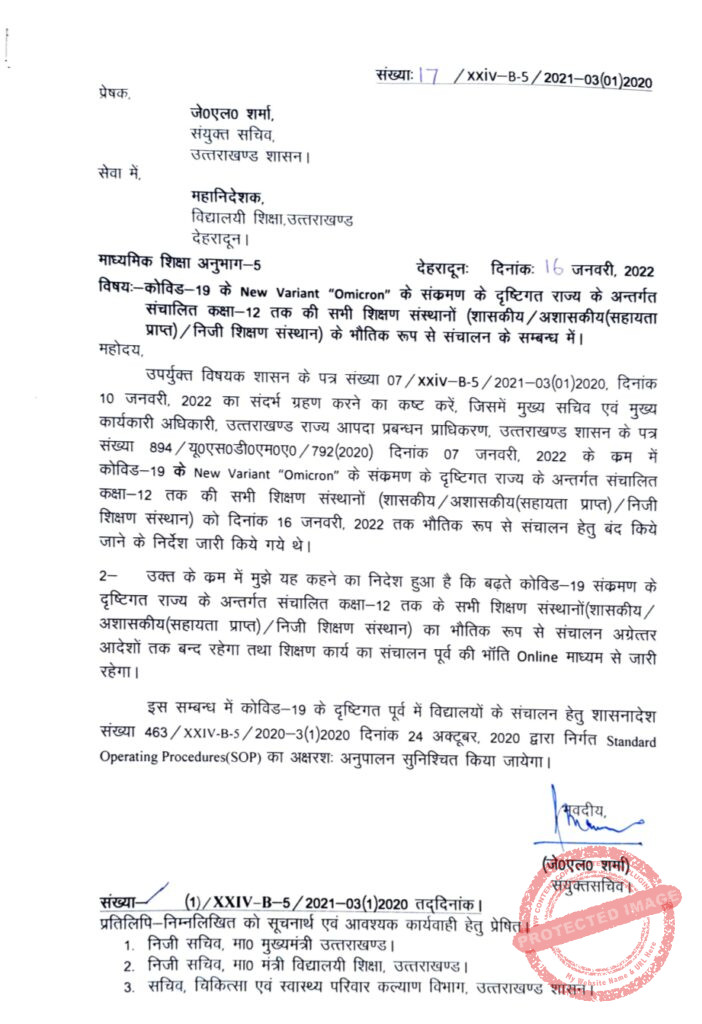 उत्तराखण्ड में कोरोना संक्रमण के तेजी से बढ़ते मामले को देखते हुए 12वीं तक के स्कूल बंद रहेंगे इसके आदेश जारी किए जा चुके हैं। आदेश को आप तस्वीर से वेरिफाई कर सकते हैं।