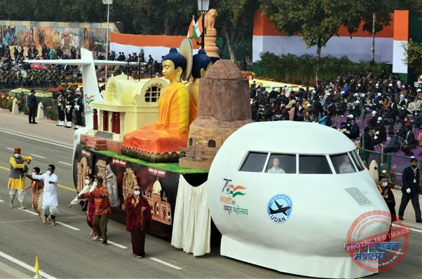 विमान के आकार की झांकी में सामने के हिस्से में भारत के विमानन में महिला शक्ति का चित्रण करते हुए महिला पायलटों को दिखाया, क्योंकि भारत विश्व स्तर पर महिला वाणिज्यिक पायलटों में सबसे ऊपर है। झांकी के पिछले हिस्से में बौद्ध धर्म के प्रतीक और उड़ान का आदर्श वाक्य. ‘सब उड़ें, सब जुड़ें’ दिखाया गया। मध्य भाग गया में बुद्ध प्रतिमा की विशेषता वाले बौद्ध सर्किट को प्रदर्शित किया गया, जहां उन्होंने ज्ञान प्राप्त किया, धमेख स्तूप, सारनाथ जहां उन्होंने अपना पहला उपदेश (धर्मचक्र परिवर्तन) दिया और महापरिनिर्वाण स्तूप, कुशीनगर जहां उन्होंने महापरिनिर्वाण प्राप्त किया इन सबको दिखाया गया। झांकी के मध्य भाग के दोनों किनारों में धरोहर स्थलों को दर्शाया गया। इसमें उत्तर से हुमायूं का मकबरा, पूर्व में कोणार्क सूर्य मंदिर, दक्षिण में हम्पी मंदिर का रथ और पश्चिम में अजंता की गुफाएं दिखाई गई हैं, जो हवाई सेवाओं से जुड़ी हैं।